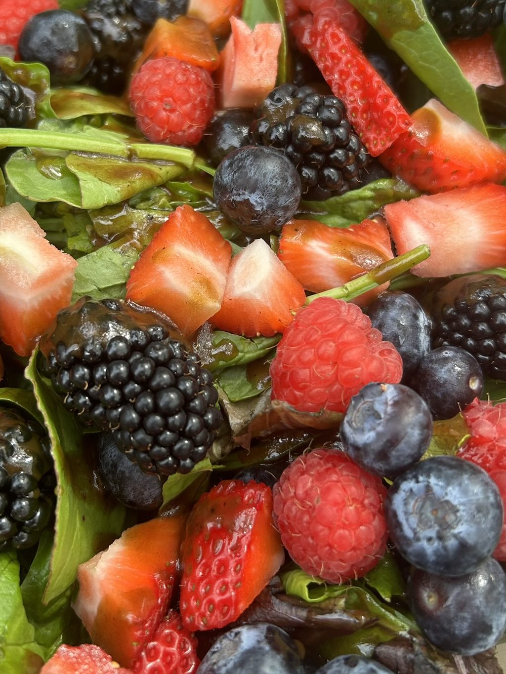 - Get the berries washed, remove the stems and tops. Cut your strawberries, if needed, and add them all to the top of your spring mix herb blend.