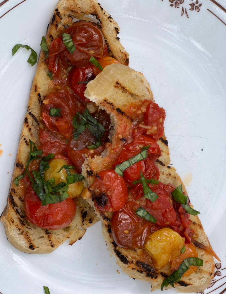 - Assembly: one slice of grilled bread, a few scoops of the blistered tomato bruschetta, sprinkle of basil chiffonade and a light drizzle of balsamic glaze, if using.