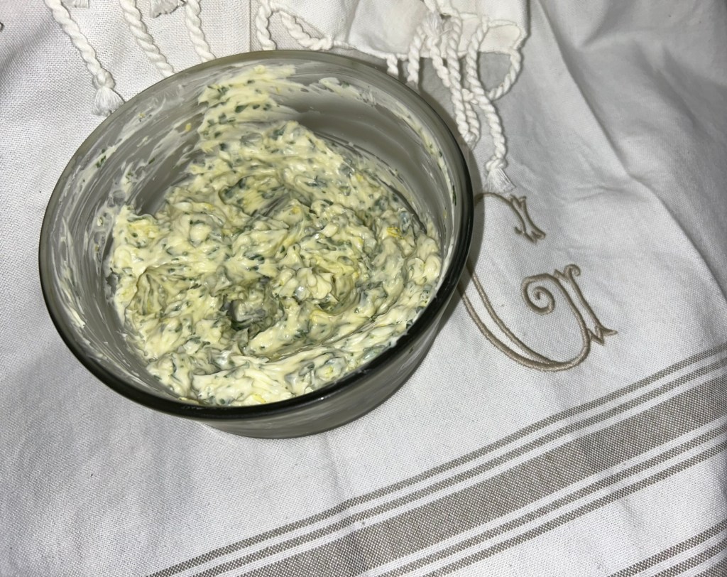 - Peel and crush our garlic, mince your herb(s) of choice and zest your lemon into the same bowl with the butter.