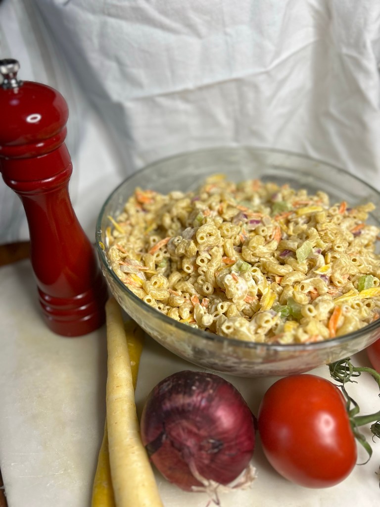 - Drain Pasta, once cooking time is up. Add to bowl with veggies, mix. If needed, add more Vegan Mayo. It’s important to add the pasta, while its still hot, because it will help it absorb all the flavors, while it cools.