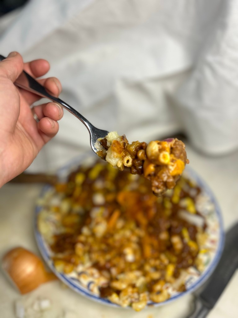 - On a plate, put Classic Vegan, Gluten-Free Macaroni Salad on half, and the Hash Browns on the other half.