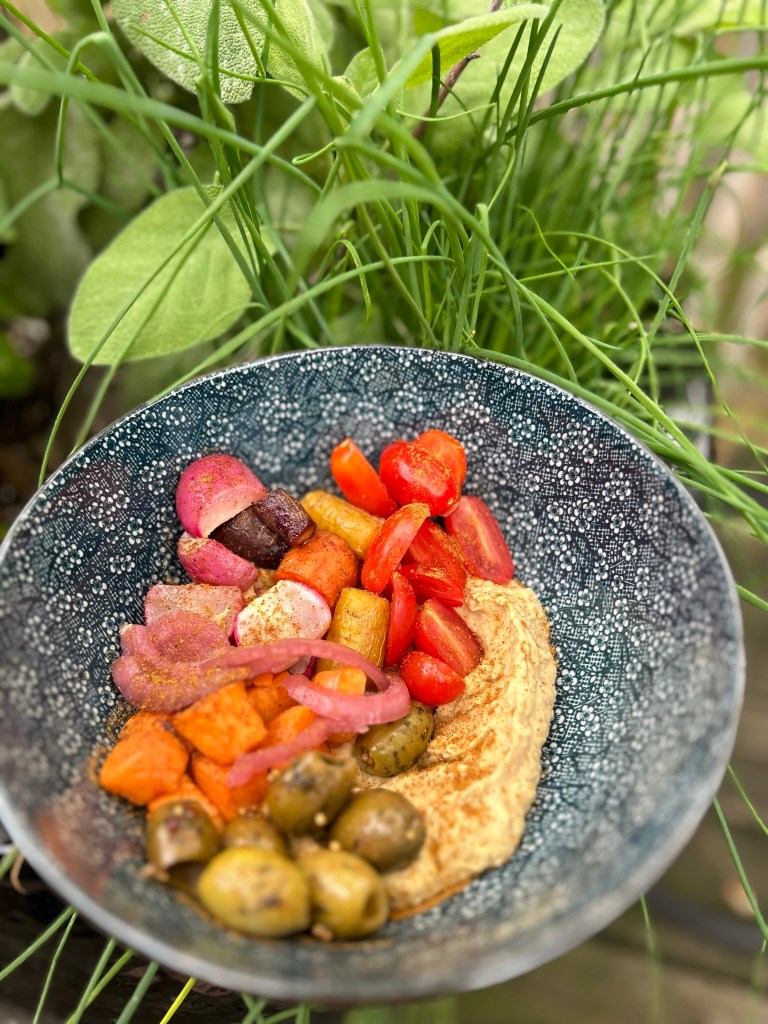 - Take your Roasted Root Veggies of choice, Blistered Olives, Pickled Onions and Halved Grape Tomatoes and add to the top of the hummus.