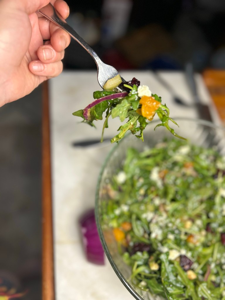 - Once the beets are roasted, carefully add them to the Arugula salad, add dressing, toss to combine.