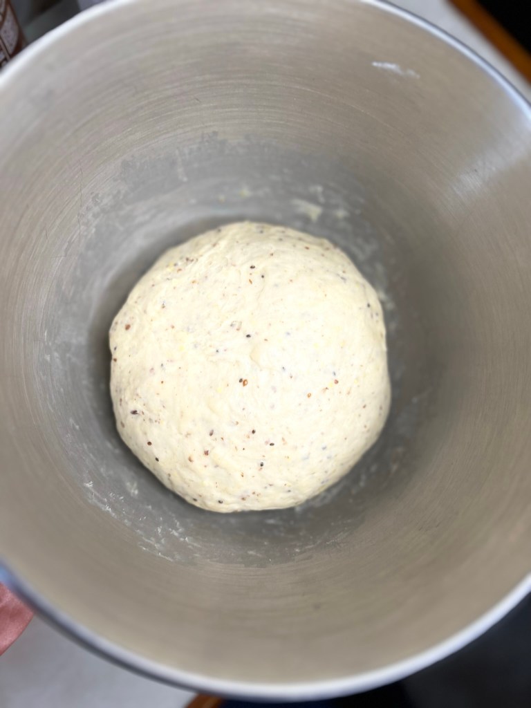- With the dough hook attachment, mix your dough, on the lowest setting, until the dough ball clings to the hook. Roughly 4 – 6 minutes.